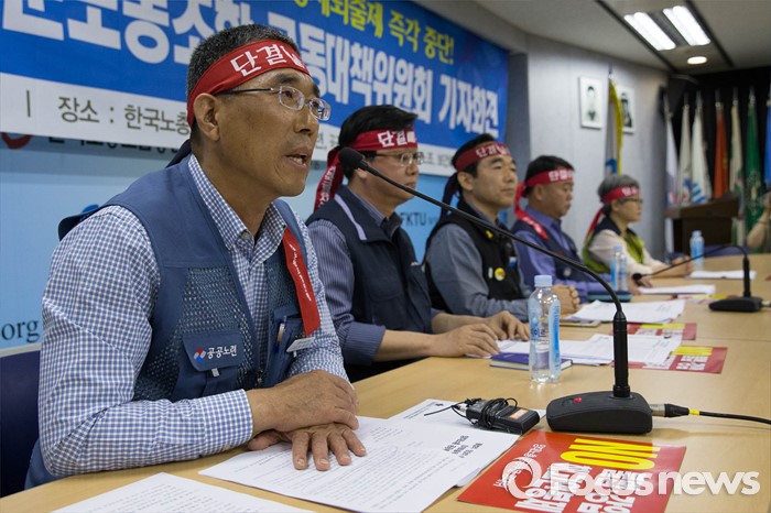 (서울=포커스뉴스) 10일 오전 서울 영등포구 한국노총회관에서 열린 '양대노총 공공부문 공대위 기자회견'에 참석한 공동위원장들이 투쟁계획을 밝히고 있다.