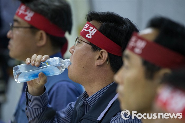 (서울=포커스뉴스) 10일 오전 서울 영등포구 한국노총회관에서 열린 '양대노총 공공부문 공대위 기자회견'에 참석한 금융노조 김문호 공동위원장이 물을 마시고 있다.