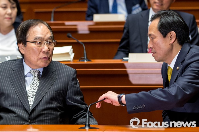 (서울=포커스뉴스) 우상호(오른쪽) 더불어민주당 원내대표가 10일 오전 서울 여의도 국회에서 열린 초선 당선자 워크숍에 강연자로 나선 임채정 전 국회의장과 대화를 나누고 있다.