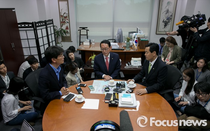 (서울=포커스뉴스) 김도읍(가운데) 새누리당 원내수석부대표, 박완주(왼쪽) 더불어민주당 원내수석부대표, 김관영 국민의당 원내수석부대표가 10일 오후 서울 여의도 국회 의원회관에서 박근혜 대통령과 여야 신임 원내지도부 회동 의제 조율을 위한 논의를 하고 있다.