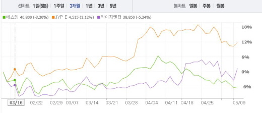 정 연구원은 “연예기획사의 주가가 PER 25~30배 수준을 유지하고 있다”며 “현재 연예기획사들의 영업이익 성장 정체가 지속되고 있는데, 현재 수준에서 주가 상승을 하기 위해서는 추가적인 이익 성장이 나타나야 한다”고 설명했다.3개월간 주가흐름<사진출처=네이버 캡쳐>