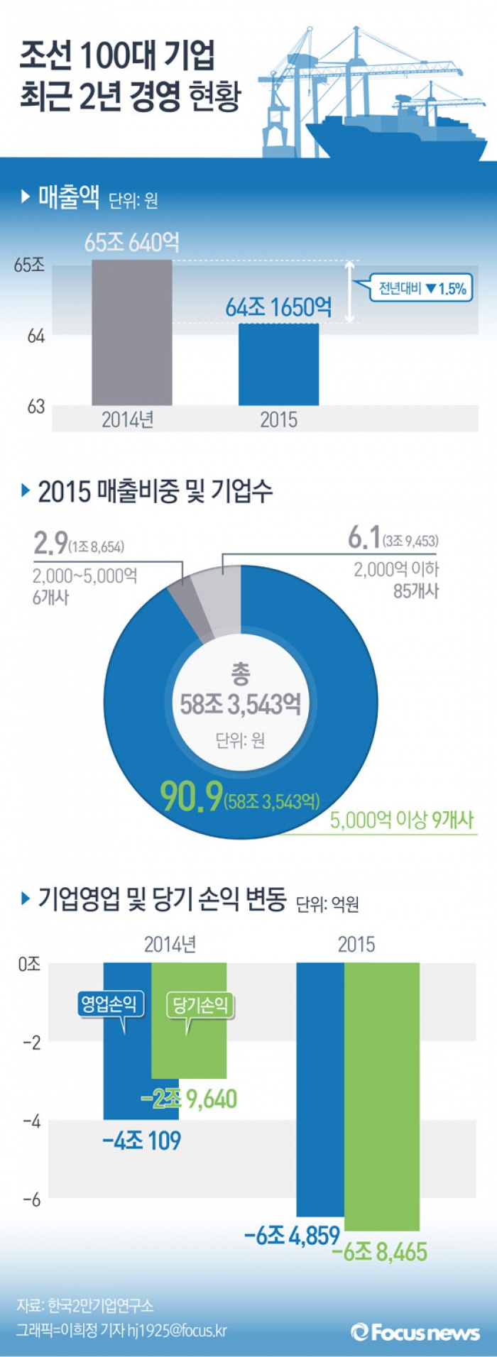 (서울=포커스뉴스) 한국2만기업연구소의 10일 발표에 따르면 국내 조선 업계 100개사의 지난해 매출은2014년보다 8890억원 줄어든 총 64조1650억원으로 나타났다. 2015년 기준 매출 5000억원을 넘는 대기업 9곳의 매출 합계는 58조3542억원으로, 매출 총합의 90.9%나 차지했다.