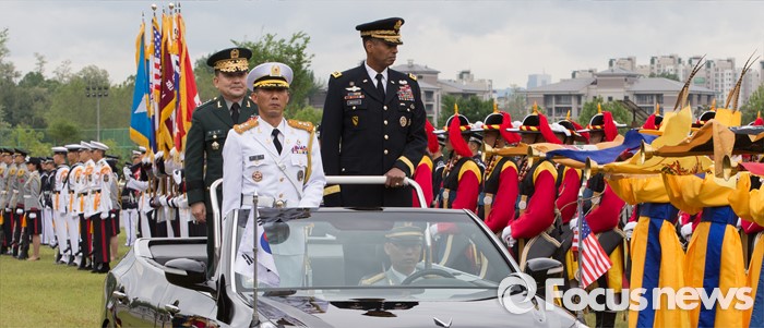 (서울=포커스뉴스) 10일 오후 서울 용산구 합동참모본부 대연병장에서 열린 환영 의장행사에서 빈센트 브룩스 신임 한·미연합사령관 겸 주한미군사령관과 이순진 합참의장이 의장대 사열을 하고 있다.