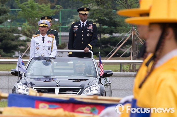 (서울=포커스뉴스) 10일 오후 서울 용산구 합동참모본부 대연병장에서 열린 환영 의장행사에서 빈센트 브룩스 신임 한·미연합사령관 겸 주한미군사령관과 이순진 합참의장이 의장대 사열을 하고 있다.