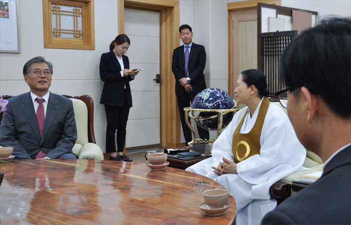 | △ 한은숙 원불교 교정원장과 면담하는 문재인 |