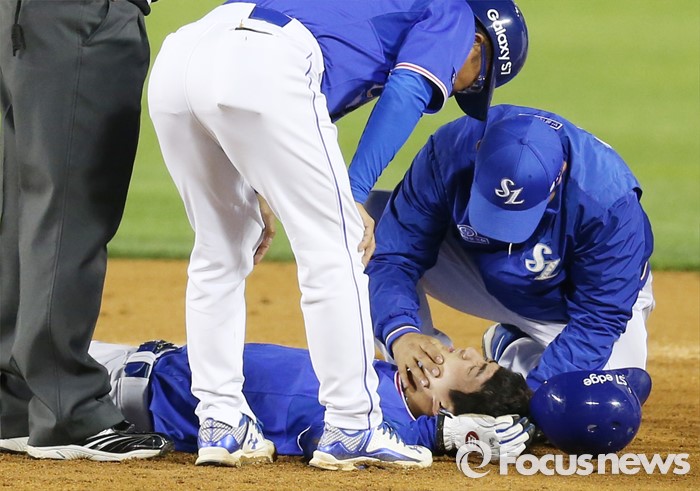 (서울=포커스뉴스) 10일 서울 잠실구장에서 열린 2016 프로야구 삼성-LG 경기 4회초 1사후 삼성 1루주자 구자욱이 이승엽 타석때 2루 도루를 시도하가 LG 유격수 오지환과 충돌해 그라운드에 쓰러져 트레이너의 치료를 받고 있다.