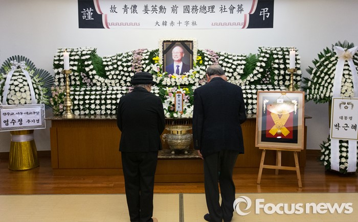 (서울=포커스뉴스) 10일 오후 서울 송파구 서울아산병원 장례식장에 마련된 故 강영훈 전 국무총리의 빈소에서 조문객들이 조문하고 있다.