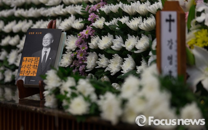 (서울=포커스뉴스) 10일 오후 서울 송파구 서울아산병원 장례식장에 마련된 故 강영훈 전 국무총리의 빈소에 고인의 회고록이 놓여 있다.