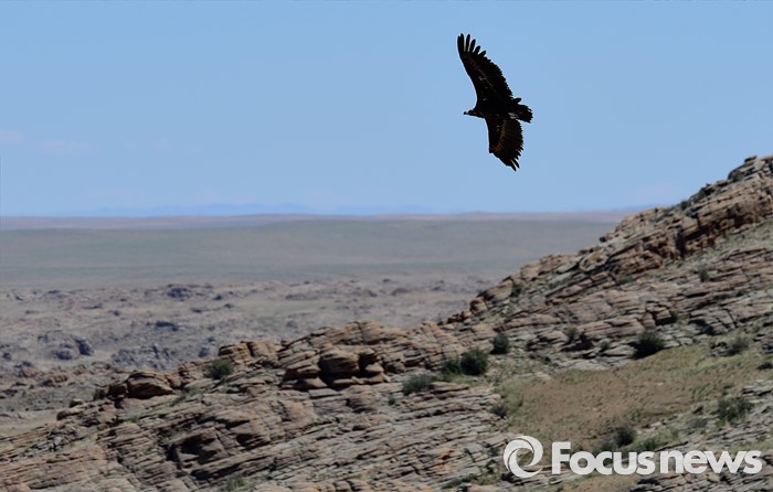 (바가 가즈링 촐로/몽골=포커스뉴스) 먼동이 트고 상승기류가 불자 독수리가 둥지에서 먹이를 찾아 평원으로 날아가고 있다.