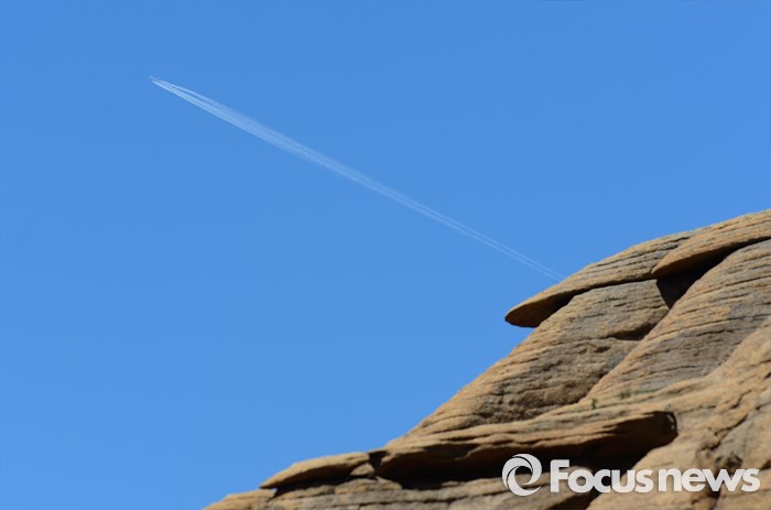(바가 가즈링 촐로/몽골=포커스뉴스)몽골 상공을 통과하는여객기가 맑은 하늘에 궤적을 남기며, 바가 가즈링 촐로의 화강암과 묘한 대조를 이루고 있다.