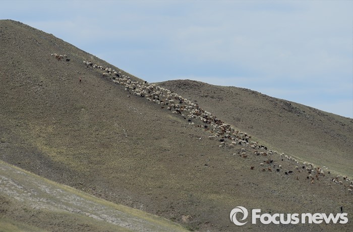 (바가 가즈링 촐로/몽골=포커스뉴스) 바가 가즈링 촐로의 산등성 까지 먹이를 찾아 올라가는 염소와 양떼들.