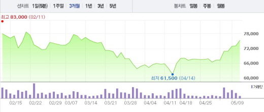 임민규 현대증권 연구원은 “채널 경쟁력 강화에 기반한 방송부문 성장성이 기대 이상”이라며 “광고 성수기인 2분기에도 실적 호조가 예상된다”고 말했다.주가흐름<사진출처=네이버 캡쳐>