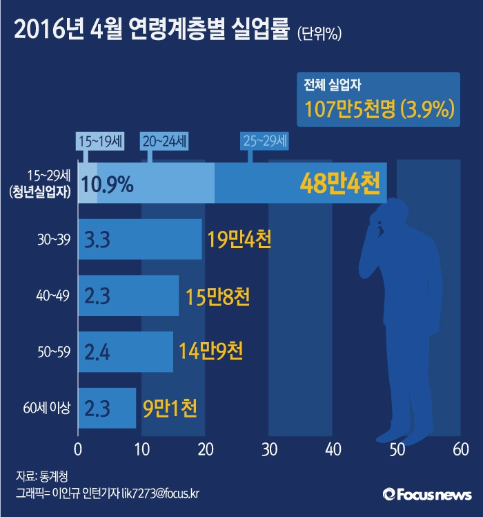 (서울=포커스뉴스) 통계청이 11일 발표한 '4월 고용동향'에 따르면 4월 청년(15∼29세)실업률은 10.9%로 전년 동월 대비 0.7%포인트 증가했다.