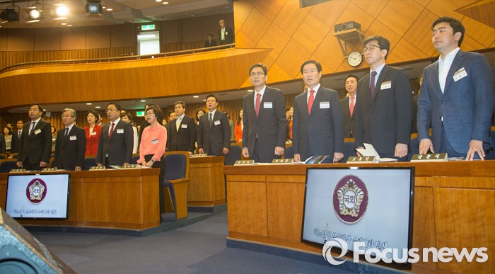 (서울=포커스뉴스) 11일 오전 서울 여의도 국회 헌정기념관에서 열린 20대 국회 초선의원 의정연찬회에 참석한 당선인들이 애국가를 부르고 있다.