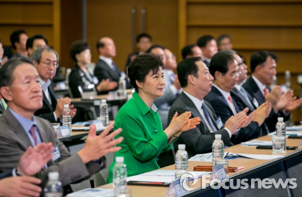 이날 토론회는 경제외교 성과보고 및 경제계 건의, 경제협력 및 1대1 상담 성공사례 발표, 주형환 산업통상자원부 장관의 해외 진출 성과 제고와 확산 방안 보고, 토론 순으로 진행됐다.사진은 2014년 7월7일 대한상공회의소 국제회의장에서 열린 중앙아시아 순방 경제사절단 합동 토론회에 참석한 박근혜 대통령. 2014.07.07. <사진출처=청와대>