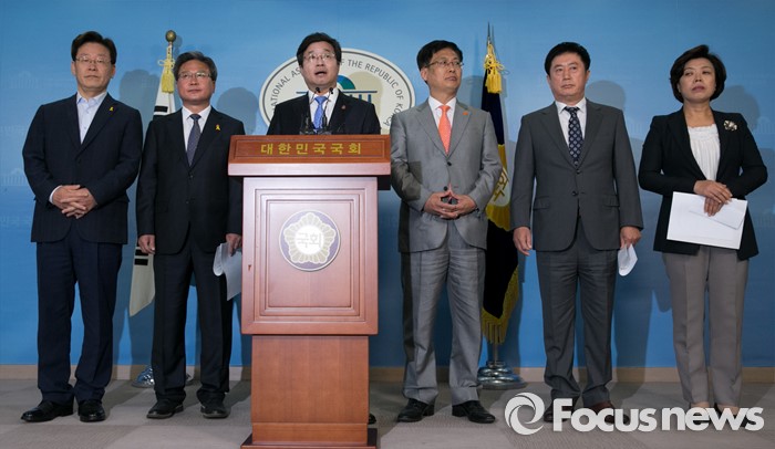 (서울=포커스뉴스) 경기도 6개 기초단체장이 11일 오전 서울 여의도 국회 정론관에서 조정교부금 배분제도 변경에 따른 입장발표 기자회견을 마친 뒤 취재진 질문에 답하고 있다. 왼쪽부터 이재명 성남시장, 채인석 화성시장, 신계용 과천시장, 염태영 수원시장, 최성 고양시장, 정찬민 용인시장.