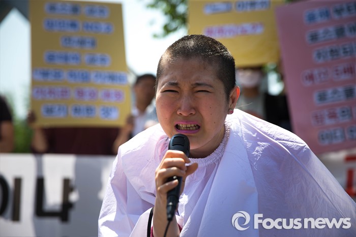 (서울=포커스뉴스) 11일 오전 서울 관악구 서울대학교 앞에서 사시존치를위한고시생모임 회원 황지나씨가 교육부의 전수조사 결과 발표를 규탄하며 삭발식을 하고 있다.