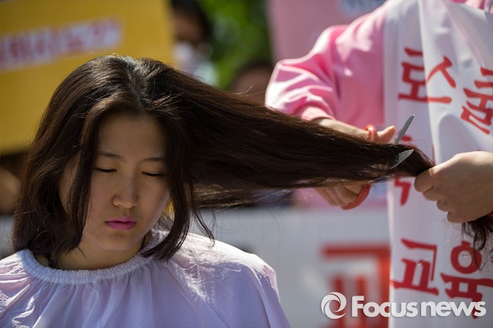(서울=포커스뉴스) 11일 오전 서울 관악구 서울대학교 앞에서 사시존치를위한고시생모임 회원 황지나씨가 교육부의 전수조사 결과 발표를 규탄하며 삭발식을 하고 있다.