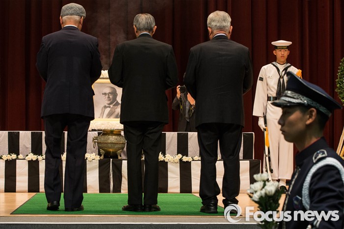 (서울=포커스뉴스) 11일 오전 서울 동작구 국립현충원에서 열린 '철기 이범석 장군 제44주기 추모제' 참석자들이 헌화 및 분향하고 있다.