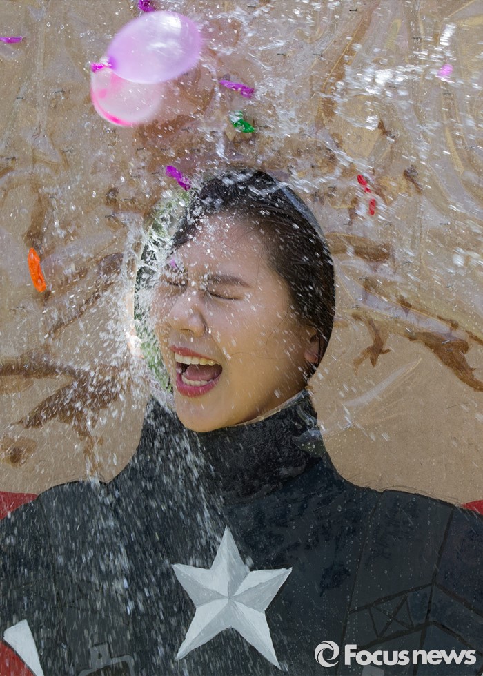 (대전=포커스뉴스) 대학축제가 한창인 11일 오전 대전 대덕구 한남대학교에서 학생들이 물풍선을 맞고 있다.