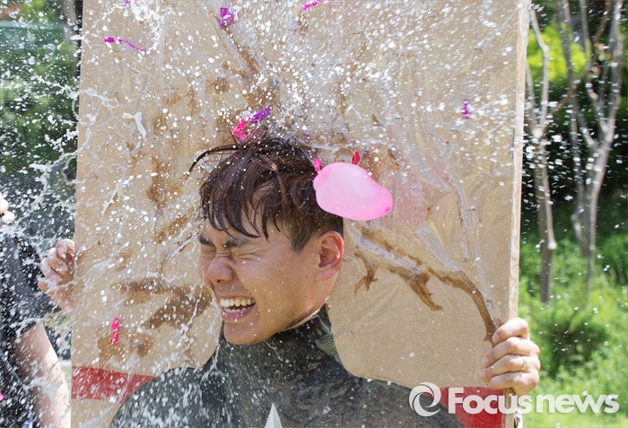 (대전=포커스뉴스) 대학축제가 한창인 11일 오전 대전 대덕구 한남대학교에서 학생들이 물풍선을 맞고 있다.