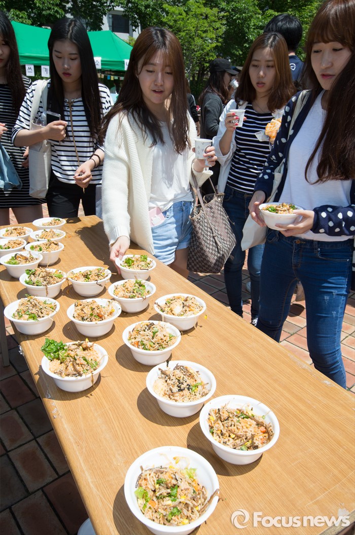 (대전=포커스뉴스) 11일 오전 대전 대덕구 한남대학교에서 이덕훈 총장과 학생들이 개교 60주년 기념 대형 비빔밥을 학생들에게 나눠주는 행사를 갖고 있다.