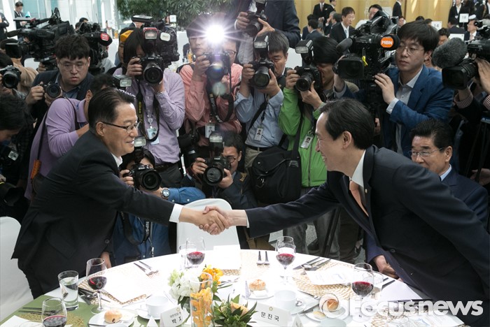 (서울=포커스뉴스) 11일 오후 서울 여의도 국회 의원회관에서 열린 20대 국회 초선의원 의정연찬회 오찬에 참석한 우상호(오른쪽) 더불어민주당 원내대표와 박지원 국민의당 원내대표가 인사하고 있다.