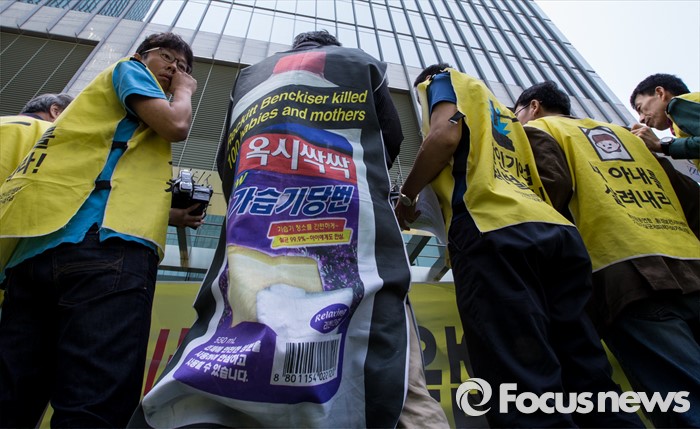 (서울=포커스뉴스)영국과 덴마크에서 옥시레킷벤키저 본사와 케톡스 본사를 항의 방문했던 가습기 살균제 피해자 유족과 시민단체가 11일 오후 서울 영등포구 여의도 옥시 한국본사 앞에서 귀국 기자회견을 갖고 있다.