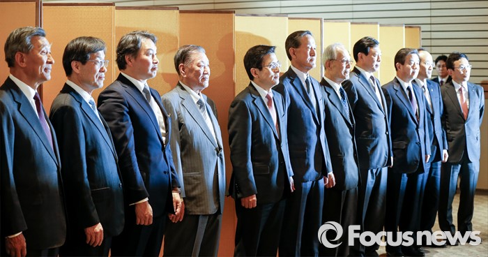 박용만 대한상의 회장은 이날 행사에 참석 "국가가 나서 상대국 정상과 비즈니스 물꼬를 틔우는 것은 기업들에게 큰 의미가 있는 만큼, 파급효과를 인식해 앞으로도 활발한 경제외교를 펼쳐나갈 것"이라고 강조했다.(서울=포커스뉴스) 황교안 국무총리가 서울 영등포구 전국경제인연합회관에서 열린 '전경련 회장단 초청만찬'에 자리해 회장단과 사진촬영을 하고 있다. 왼쪽부터 박영주 이건산업 회장, 권오준 포스코 회장, 최태원 SK 회장, 정몽구 현대자동차그룹 회장, 황교안 국무총리, 허창수 전국경제인연합회 회장, 이준용 대림산업 회장, 신동빈 롯데그룹 회장, 김윤 삼양홀딩스 회장, 추경호 국무조정실장, 이승철 전국경제인연합회 부회장. 강진형 기자2016.04.13 2016.04.29 박봉균 기자
