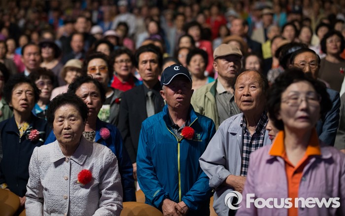 (서울=포커스뉴스) 11일 오후 서울 강남구 코엑스에서 열린 제44회 어버이날 기념 효드림 축제에 참석한 어르신들이 애국가를 부르고 있다.