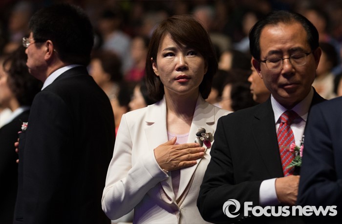 (서울=포커스뉴스) 11일 오후 서울 강남구 코엑스에서 열린 제44회 어버이날 기념 효드림 축제에 참석한 내빈들이 국민의례를 하고 있다. 왼쪽부터 이종구 새누리당 강남갑 당선인, 전현희 더불어문주당 강남을 당선인, 김성곤 의원.