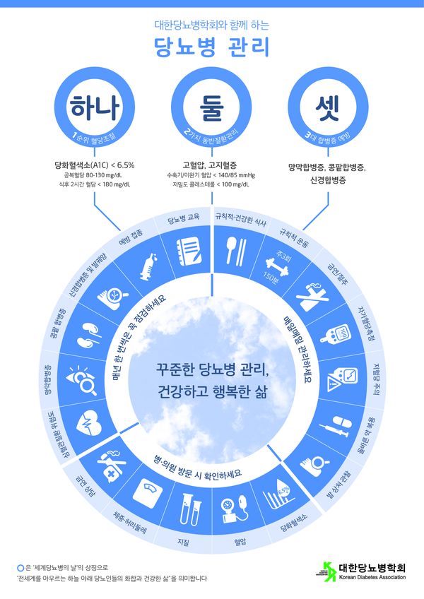 이에 따라 학회측은 혈당조절 뿐만 아니라 혈압과 콜레스테롤 수치 관리를 모두 포함한 ‘당뇨병 관리 하나 둘 셋’ 생활수칙을 개발했다.