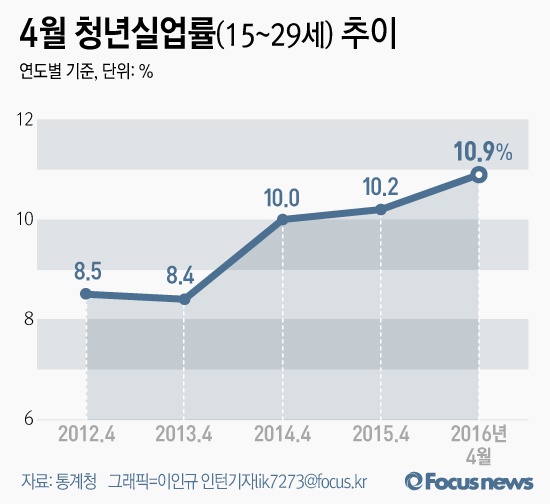 최근 5년 간 취업시즌인 4월을 기준으로 보면 지난 2012년 8.5% 이후 역대 최악(10.9%)의 실업률로 기록되고 있다.