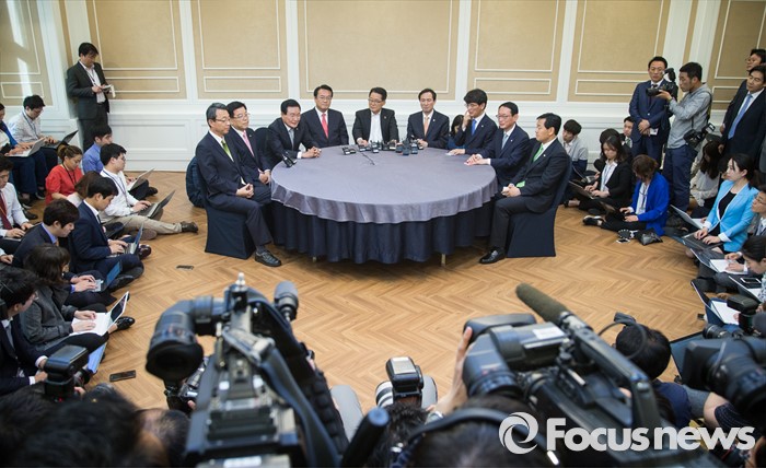 (서울=포커스뉴스) 11일 오후 서울 여의도 국회 귀빈식당에서 열린 3당 원내지도부 회동에 참석한 의원들이 취재진을 향해 포즈를 취하고 있다. 왼쪽부터 김성식 국민의당 정책위의장, 김광림 새누리당 정책위의장, 변재일 더불어민주당 정책위의장, 정진석 새누리당 원내대표, 박지원 국민의당 원내대표, 우상호 더불어민주당 원내대표, 박완주 원내수석부대표, 김도읍 새누리당 원내수석부대표, 김관영 국민의당 원내수석부대표.
