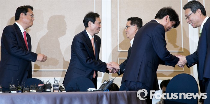 (서울=포커스뉴스) 11일 오후 서울 여의도 국회 귀빈식당에서 열린 3당 원내지도부 회동에 참석한 의원들이 인사하고 있다. 왼쪽부터 정진석 새누리당 원내대표, 우상호 더불어민주당 원내대표, 박지원 국민의당 원내대표, 박완주 더불어민주당 원내수석부대표, 김성식 국민의당 정책위의장.