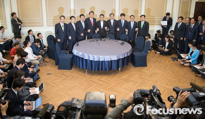 (서울=포커스뉴스) 11일 오후 서울 여의도 국회 귀빈식당에서 열린 3당 원내지도부 회동에 참석한 의원들이 취재진을 향해 포즈를 취하고 있다. 왼쪽부터 김성식 국민의당 정책위의장, 김광림 새누리당 정책위의장, 변재일 더불어민주당 정책위의장, 정진석 새누리당 원내대표, 박지원 국민의당 원내대표, 우상호 더불어민주당 원내대표, 박완주 원내수석부대표, 김도읍 새누리당 원내수석부대표, 김관영 국민의당 원내수석부대표.