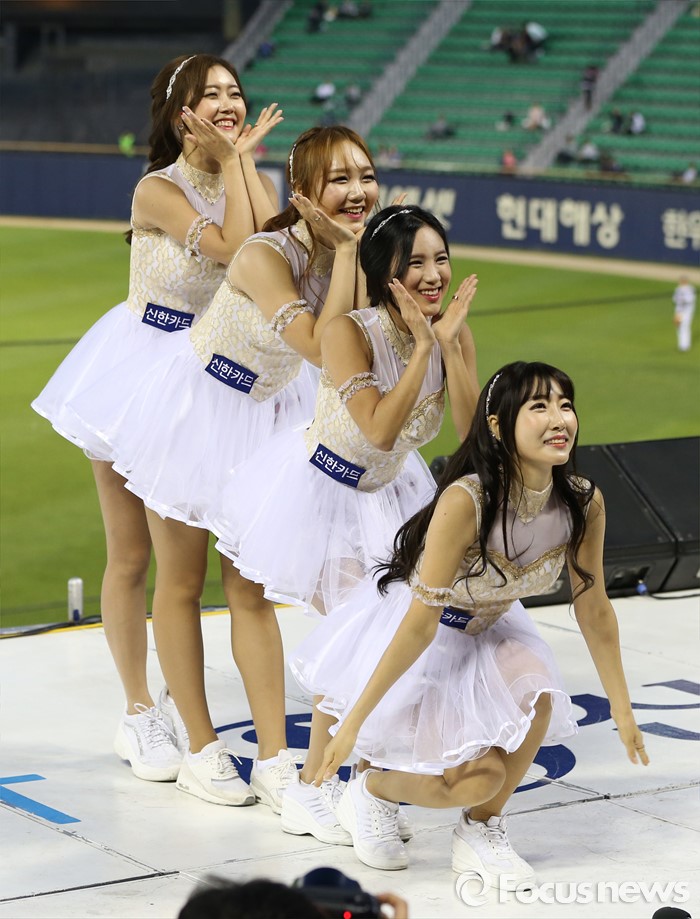 (서울=포커스뉴스) 11일 서울 잠실구장에서 열린 2016 프로야구 삼성-LG 경기에서 LG 치어리더가 순백의 짧은 치마를 입고 정열적인 안무로 관중들의 시선을 모으고 있다.