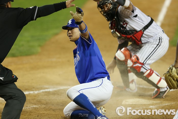 (서울=포커스뉴스) 11일 서울 잠실구장에서 열린 2016 프로야구 삼성-LG 경기 5회초 2사 2루에서 삼성 구자욱의 좌전 안타때 2루주자 박해민이 홈으로 뛰어들어 주심이 세이프 판정을 하고 있다. LG에서 합의판정을 요구해 아웃으로 번복됐다.