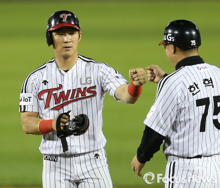 (서울=포커스뉴스) 11일 서울 잠실구장에서 열린 2016 프로야구 삼성-LG 경기 4회말 1사 만루에서 LG 오지환이 우익수 오른쪽으로 빠지는 2타점 2루타를 치고 한혁수 코치와 주먹을 마주치고 있다.