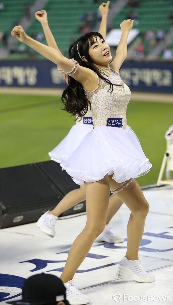 (서울=포커스뉴스) 11일 서울 잠실구장에서 열린 2016 프로야구 삼성-LG 경기에서 LG 치어리더가 순백의 짧은 치마를 입고 정열적인 안무로 관중들의 시선을 모으고 있다.