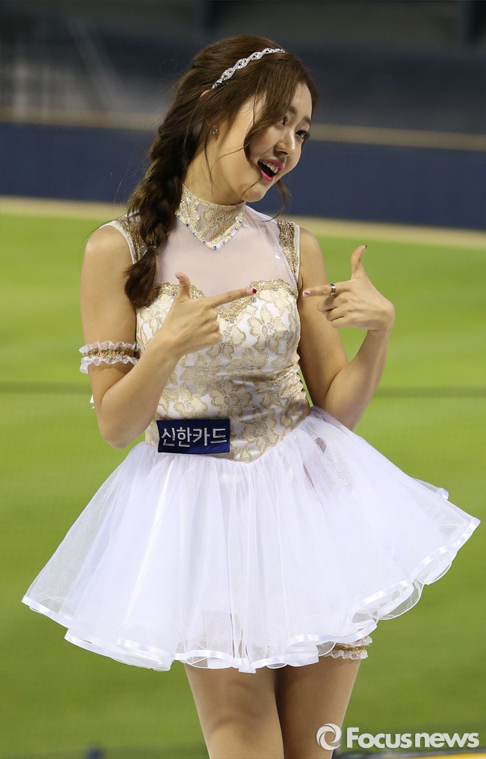 (서울=포커스뉴스) 11일 서울 잠실구장에서 열린 2016 프로야구 삼성-LG 경기에서 LG 치어리더가 순백의 짧은 치마를 입고 정열적인 안무로 관중들의 시선을 모으고 있다.