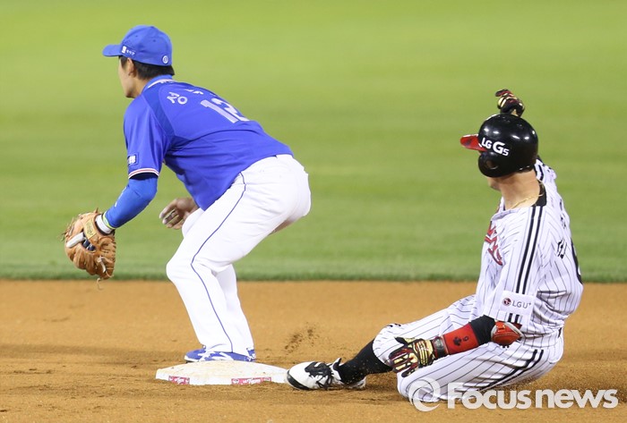 (서울=포커스뉴스) 11일 서울 잠실구장에서 열린 2016 프로야구 삼성-LG 경기 6회말 1사후 LG 손주인이 좌익수 왼쪽으로 빠지는 안타를 치고 2루에서 세이프되고 있다.