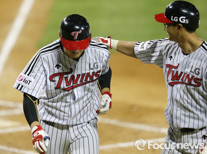 (서울=포커스뉴스) 11일 서울 잠실구장에서 열린 2016 프로야구 삼성-LG 경기 6회말 1사 1,3루에서 LG 이형종이 좌월 3점 홈런을 치고 선행주자 박용택의 환영을 받고 있다.