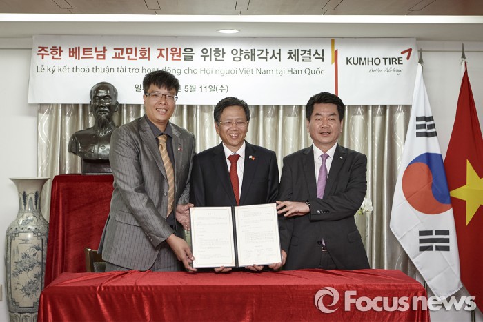 이한섭 금호타이어 사장은 11일 서울 종로구 북촌로에 위치한 주한 베트남 대사관에서팜후찌(Pham Huu Chi) 베트남 대사, 주한 베트남 교민회와 '베트남 교민회 지원에 대한 협약'을 맺었다.