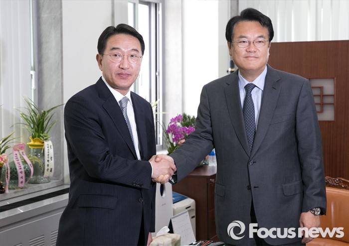 (서울=포커스뉴스) 정진석(오른쪽) 새누리당 원내대표가 12일 오전 서울 여의도 국회를 방문한 현기환 청와대 정무수석과 만나 인사하고 있다.