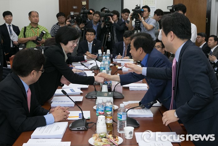 그는 "지금 특별법안이 있다고 해 가지고 며칠 남지 않은 19대에서 처리하는 것은 완벽하게 법을 만들지 못하는 것 아닌가, 이런 점을 우려한다"며 "빨리 청문회를 하고 청문회 나온 결과를 가지고 법으로 가는 게 맞다고 생각한다"고 목소리를 냈다.9일 오전 서울 여의도 국회에서 열린 환경노동위원회 법안심사소위원회에 참석한 여야 의원들이 인사하고 있다. 왼쪽부터 우원식, 장하나 더불어민주당 의원, 이완영, 김용남 새누리당 의원. 이날 환노위 법안소위는 가습기살균제의 흡입독성 화학물질에 의한 피해구제에 관한 법률안 및 가습기살균제피해구제법률안 등을 심사할 예정이다. 2016.05.09 박동욱 기자