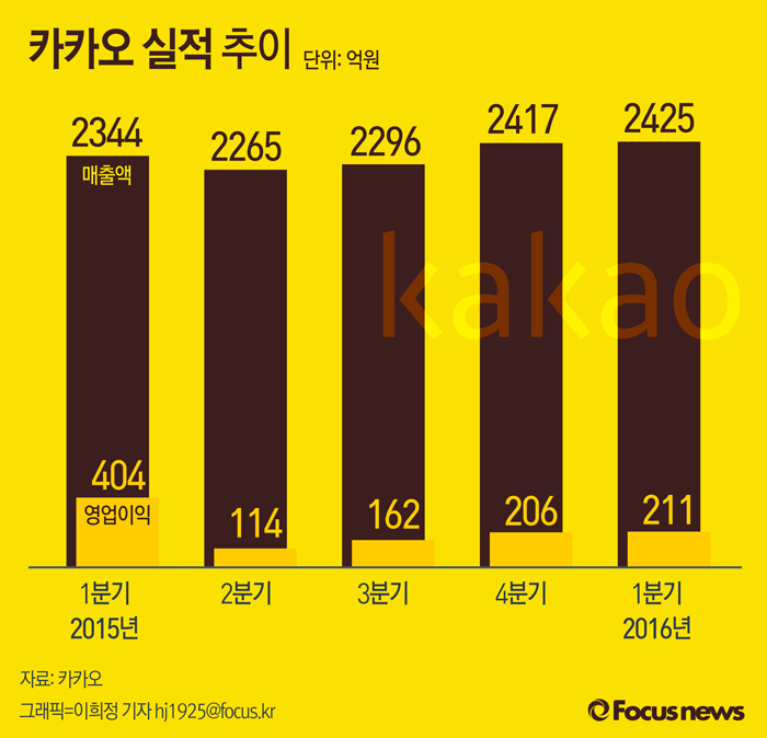 (서울=포커스뉴스) 카카오는 연결기준 올해 1분기 영업이익이 전년 동기 대비 47.7% 감소한 211억원이라고 12일 공시했다. 같은 기간 매출은 3.5% 늘어난 2425억원으로 집계됐다.
