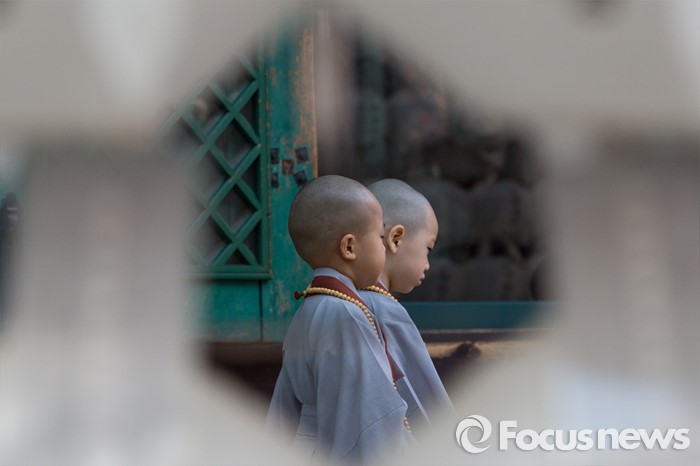 (서울=포커스뉴스) 석가탄신일을 이틀 앞둔 12일 오전 서울 종로구 조계사에서 동자승들이 경내를 둘러보고 있다.