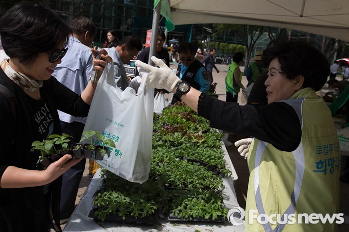 (서울=포커스뉴스) 12일 오후 서울시청 광장에서 열린 채소 모종 나눔행사에 참석한 시민들이 채소 모종이 담긴 봉지를 가져가고 있다.