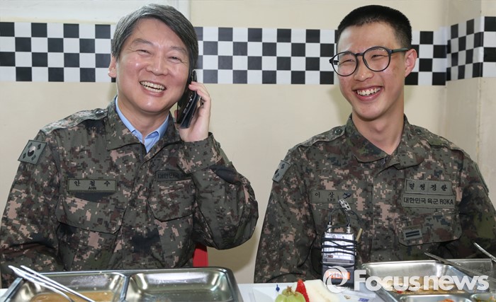 (연천=포커스뉴스) 안철수(왼쪽) 국민의당 상임공동대표가 12일 오후 경기도 연천 전방부대를 방문해 장병들과의 오찬 중 이상석 장병의 어머니와 통화를 하고 있다.